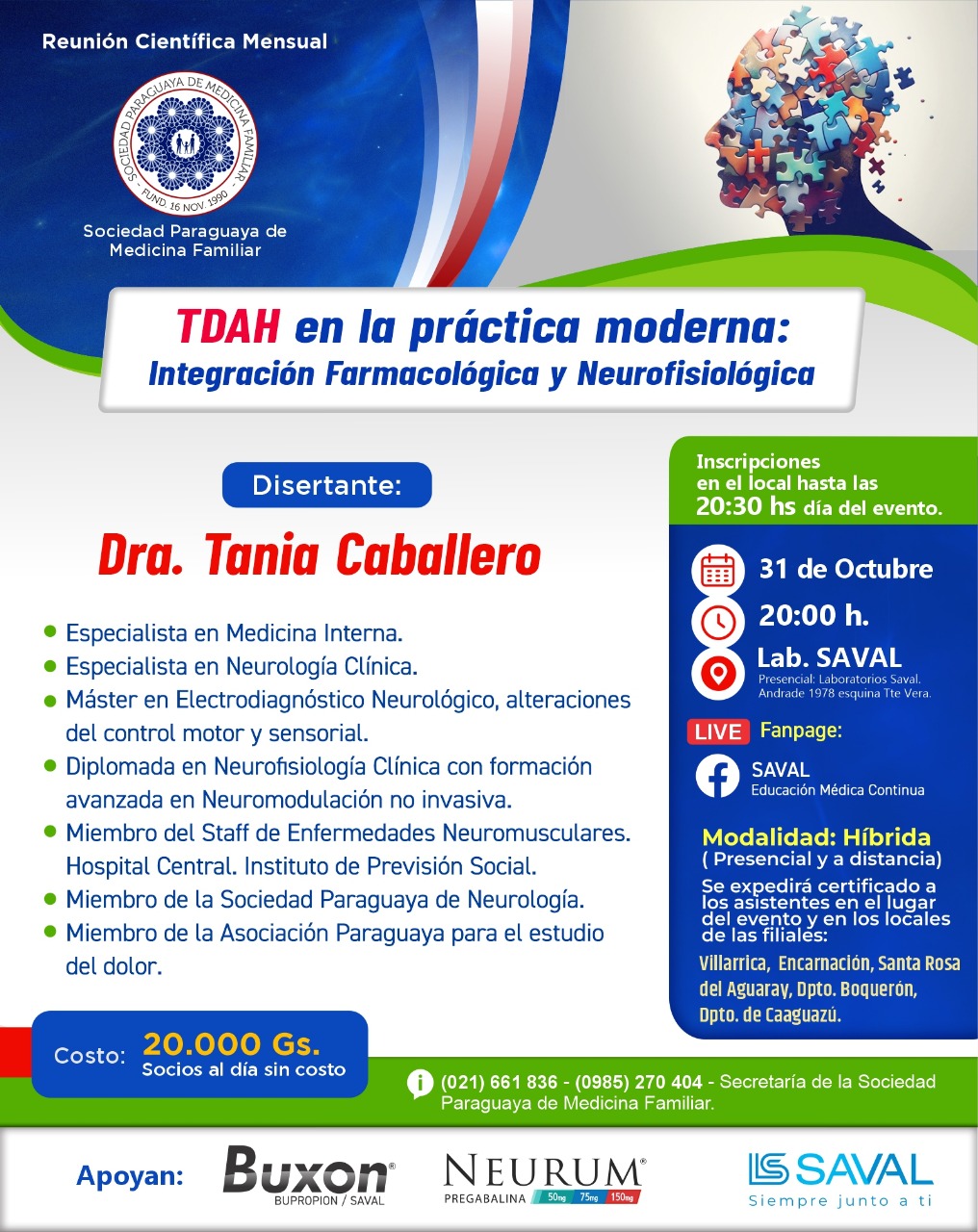 - Presencial: Laboratorios SAVAL, Andrade 1978 esquina Trifón Benítez Vera, Asunción / Virtual: Live Fanpage SAVAL Educación Médica Continua
