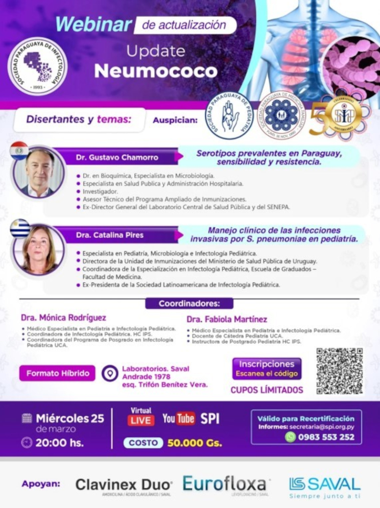 Los doctores Gustavo Chamorro y Catalina Pires abordarán, respectivamente, los siguientes temas: "Serotipos prevalentes en Paraguay, sensibilidad y resistencia" y "Manejo clínico de las infecciones invasivas por S. pneumoniae en pediatría".